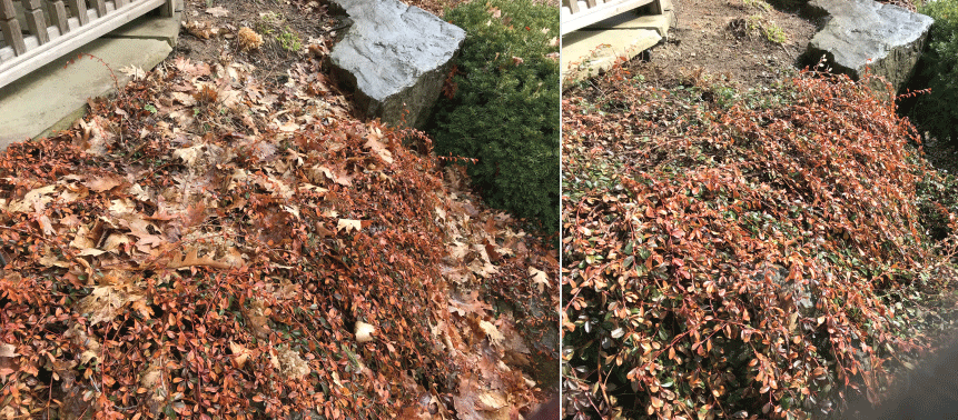 From left to right: Cotoneaster sp. covered with leaf litter from the winter; Cotoneaster sp. with leaf litter picked out.