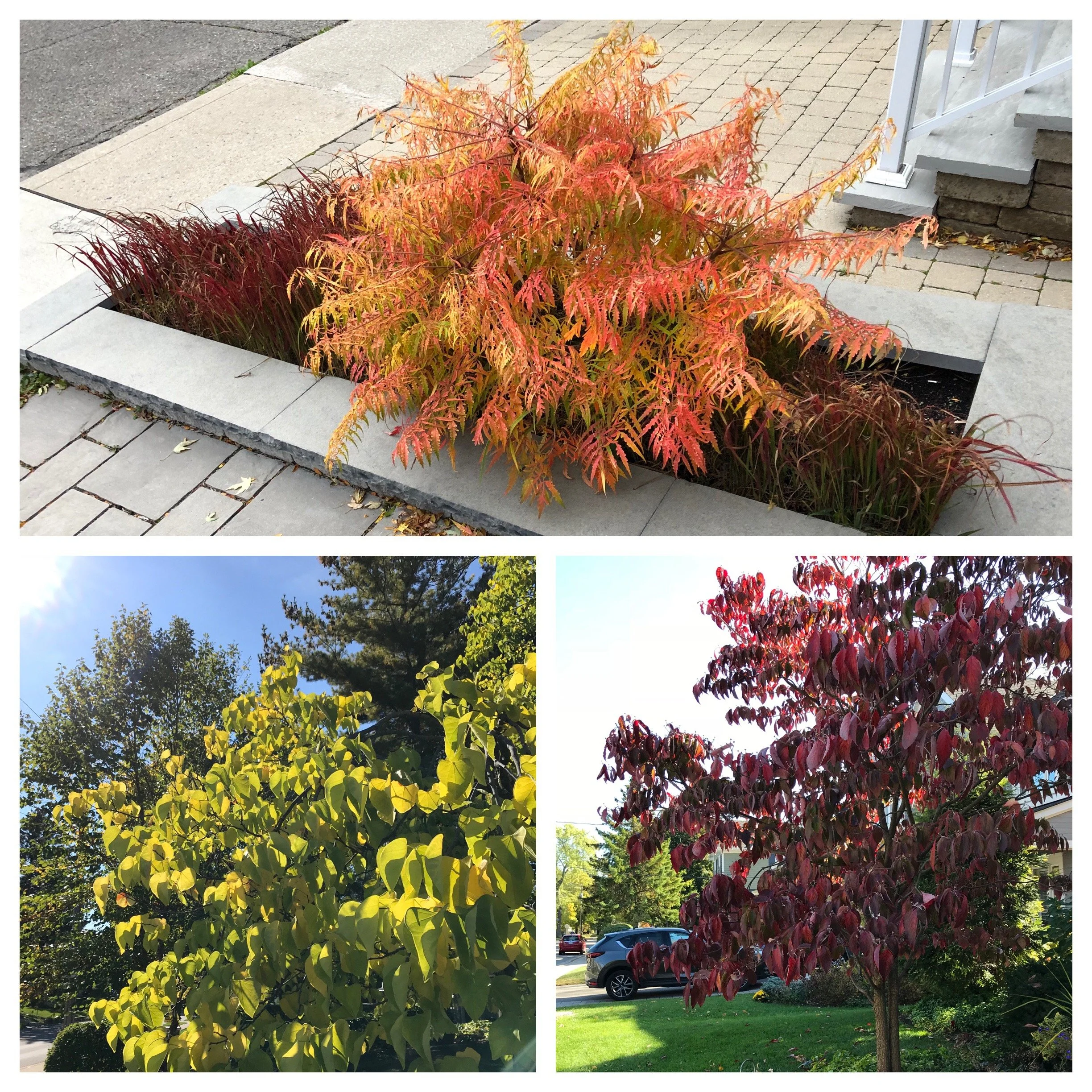 Inspiration from the garden: the gorgeous fall combination of Japanese blood grass (Imperata cylindrica ‘Red Baron’) and Tiger Eyes Staghorn Sumac (Rhus typhina ‘Bailtiger’), the yellow ‘pop’ of redbud (Cercis canadensis) foliage and the deep crimson canopy of Chinese dogwood (Cornus kousa). Top photo courtesy of Alicia K.