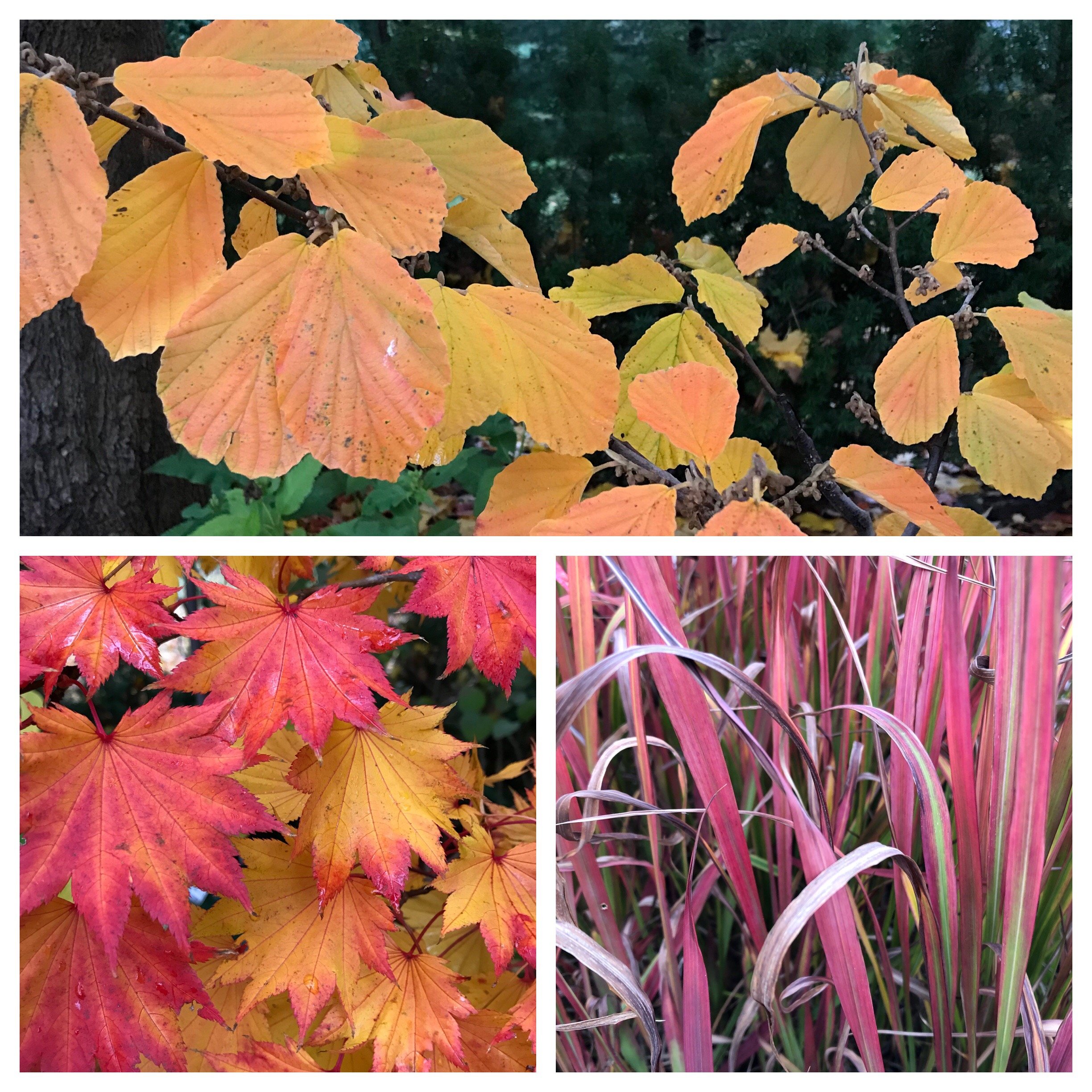 More fall colour inspiration from the garden: a 2018 photo taken In early November of witchhazel (Hamamelis x intermedia), a 2018 photo taken in early November of the spectacular colour show of ‘Full Moon’ Japanese maple (Acer shirasawanum ‘Aureum’) and another picture of Japanese blood grass (Imperata cylindrica ‘Red Baron’) courtesy of Alicia K.