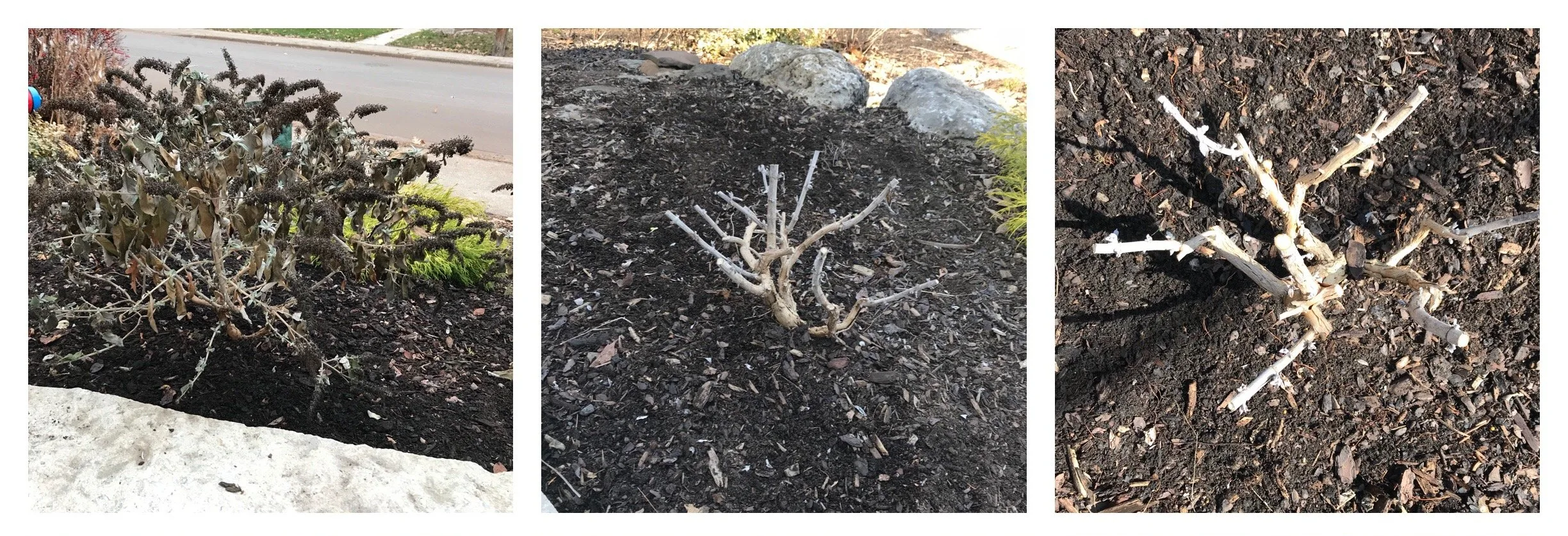 Spring pruning of Caryopteris incana ‘Jason’ (Sunshine bluebeard). Shown during it’s glory days last season (top left) and the same patch after spring pruning (top right)- not much left to see! The best way to tackle this shrub, in my opinion, is to grab a handful of branches and cut the whole thing down by half (bottom left); this removes bulk and allows you to ‘see into’ the shrub better so that the strongest stems can be selected to remain; old, weak, and dead stems can then be pruned out until you are left with a simple branching framework. The plant can then be taken down to a height of 20-30 cm (8-12 in) tall (bottom right).