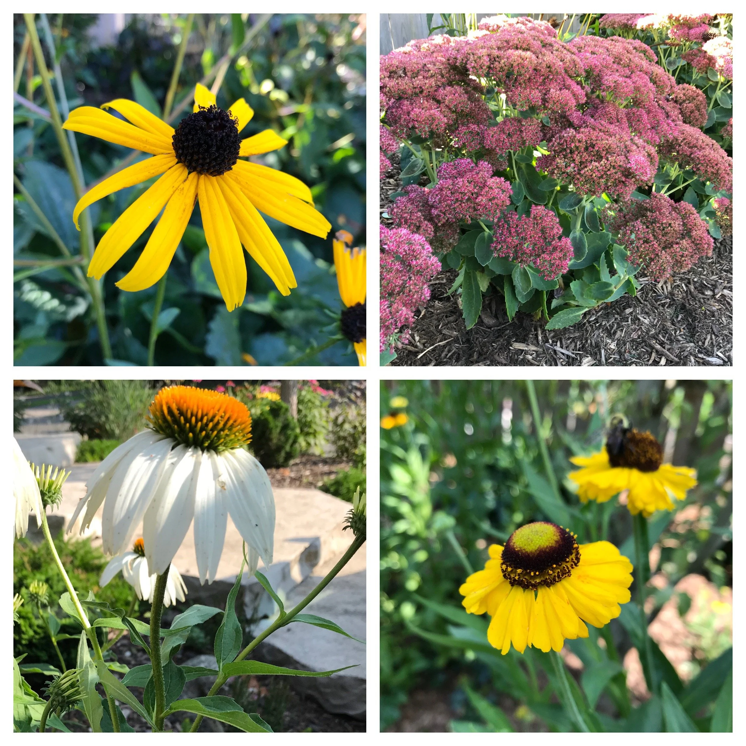 Some perennials with wildlife value. Clockwise from top left: black-eyed Susan (Rudbeckia hirta), stonecrop (Sedum spp.), sneezeweed (Helenium autumnale) and coneflowers (Echinacea spp.)