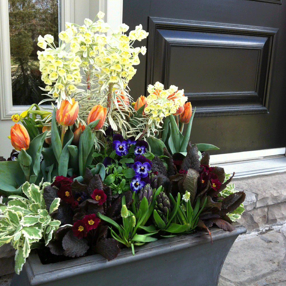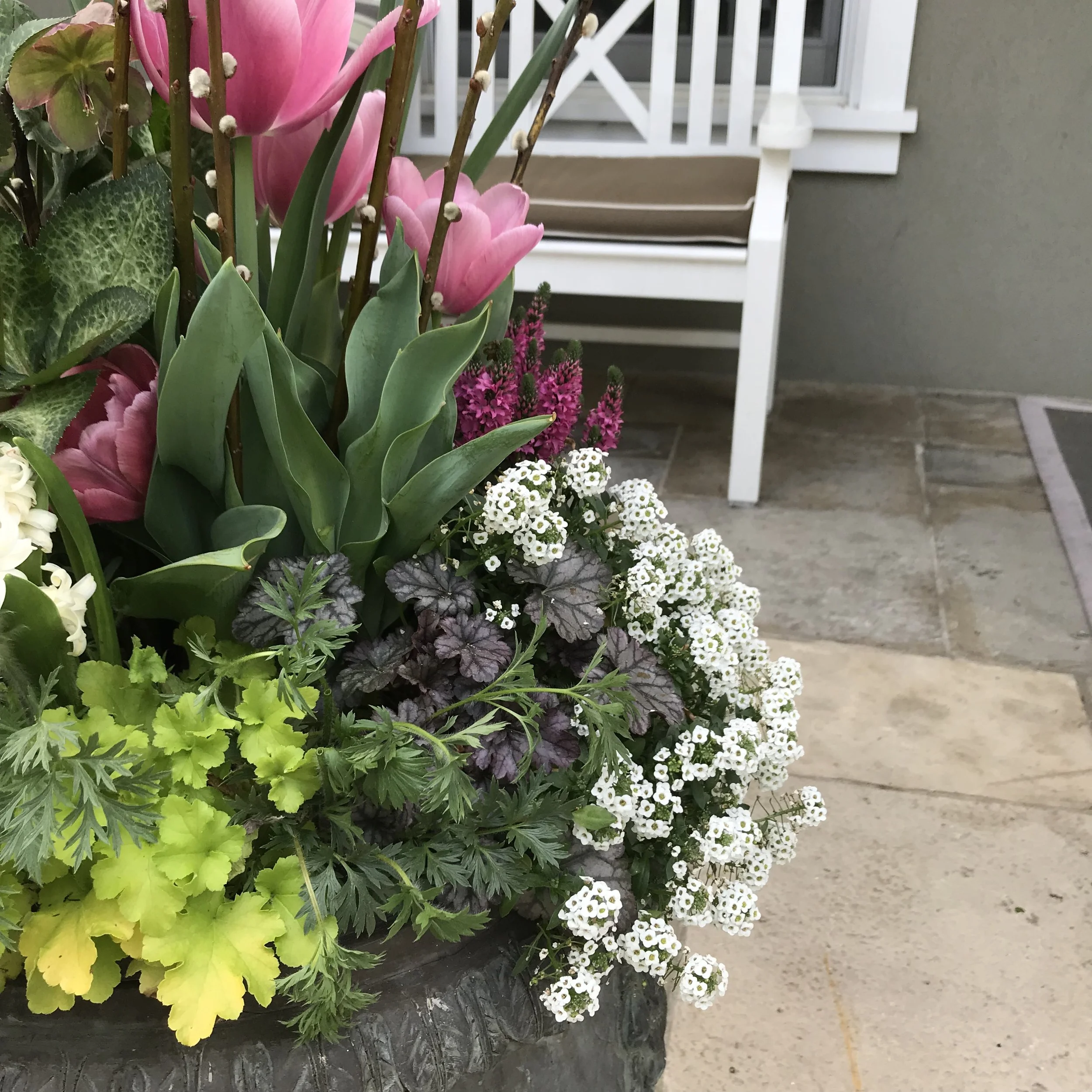 Finally, in this Spring planter, the tulips may be fading, but the purple and chartreuse colours of the Heuchea spp. (Coral bells) will continue to add colour long after the blooms are gone. This brings me to a serious ‘plus’ for adding nifty foliage to your planters or gardens- you won’t need to rely solely on blooms for colour!