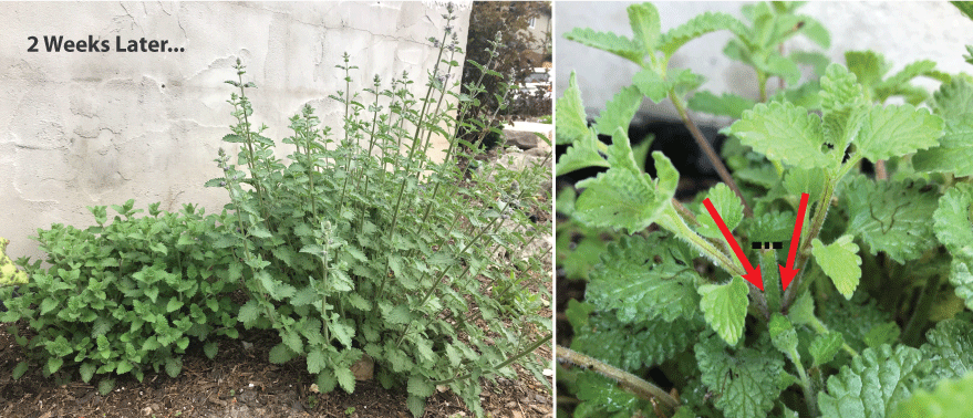 Catmint in a pollinator garden. The unpruned clump is on the verge of flowering, the other two clumps have branched out and begun growing from their new growing points (shown by the arrows). These two pruned plants will be delayed in their flowering. This forced staggering of flowering periods can help prolong bloom times for pollinators.