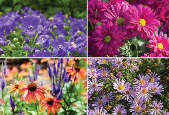 Some other perennials that can be cut back to prevent ‘the flop’ (clockwise from top left): Platycodon spp. (balloon flower), Chrysanthemum spp. Aster spp., Veronica spp. (speedwell) and Echinacea spp. (coneflower)