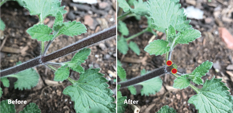 A catmint stem before and after being cut back. The red dots show the new growing points for that stem. The cutting back of the stem ultimately forces one stem to branch into two.
