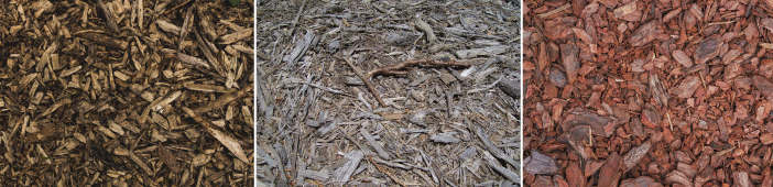 Mulches of different colours and textures. The fibers of shredded mulches (such as the mulch in the centre photo) tend to weave together to form a somewhat water-repelling layer. This mulch needs to be broken up not only to refresh it’s ‘look’ but to also allow water to get through the mulch to reach the soil below.