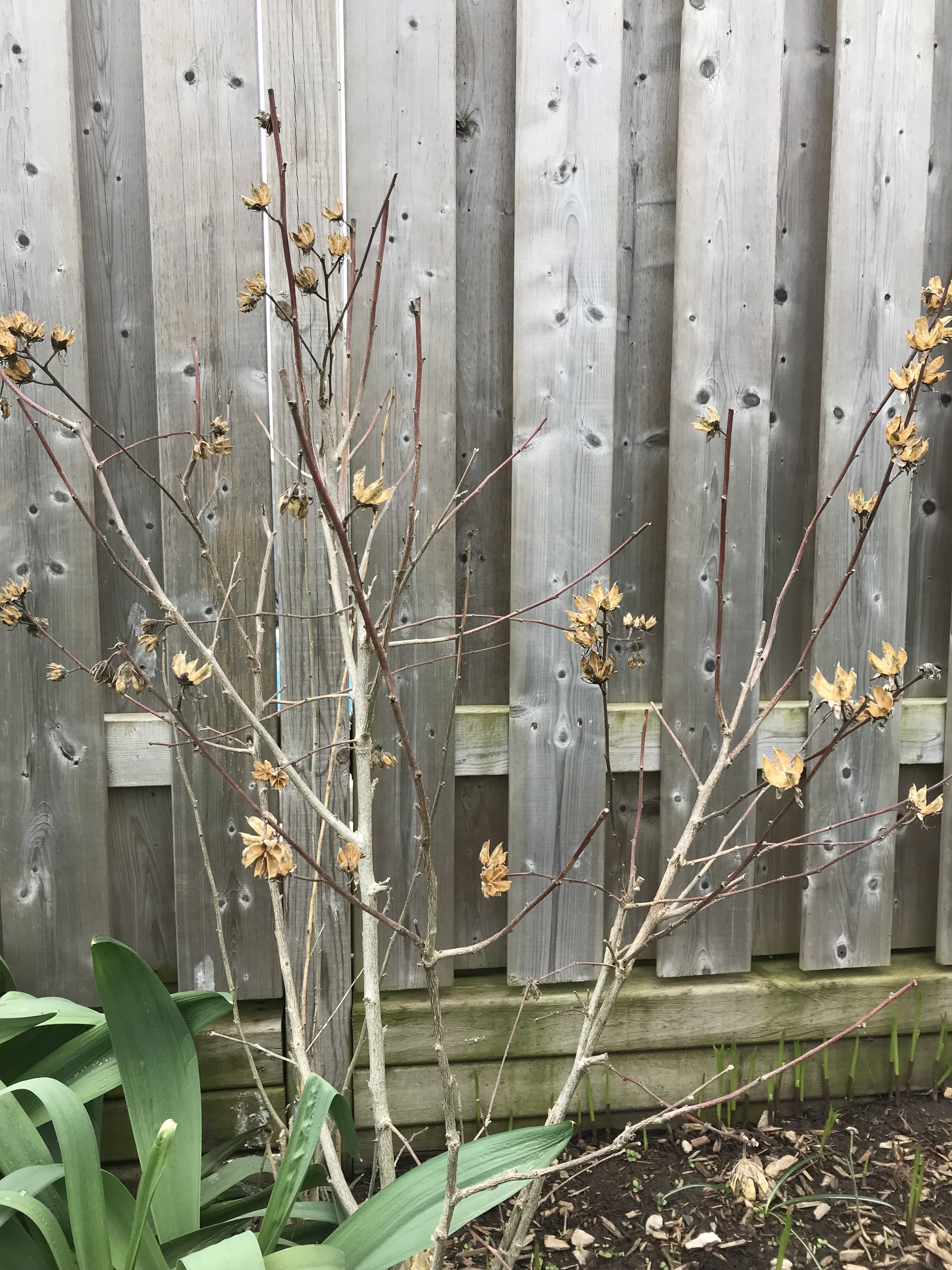 This also looks dead as a door nail- especially since every other plant on the property has started growing. In the case of woody plants such as this one, you’ll need to do a scratch test to figure out if there is still life in the plant. Scratch off the bark on a branch, if it is green underneath, it is alive!