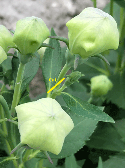 Even trickier are plants such as Platycodon (balloonflower). The buds for new flowers are actually right next to the old blooms. In this case it is just the spent bloom that gets removed, while being careful not to snip any buds in the process! The photo below shows the flower buds of balloonflower. The largest one will bloom first, get snipped off at the yellow ‘cut’ line and the smaller bud is next in line.