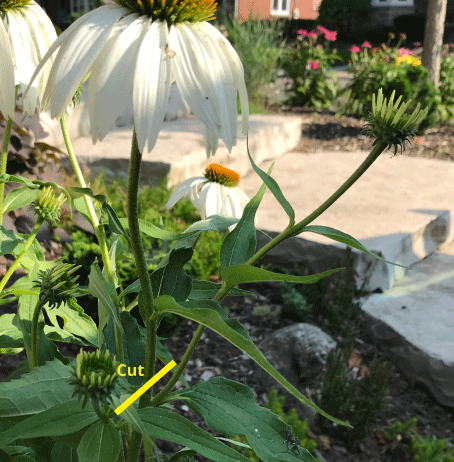As this Echinacea flower stalk enters it’s blooming period, the flowering will begin at the terminal flower bud and work downward. As flowers wane, the spent flowers can then be deadheaded to the bud that is next in line. For the Echinacea, the cut would be here…