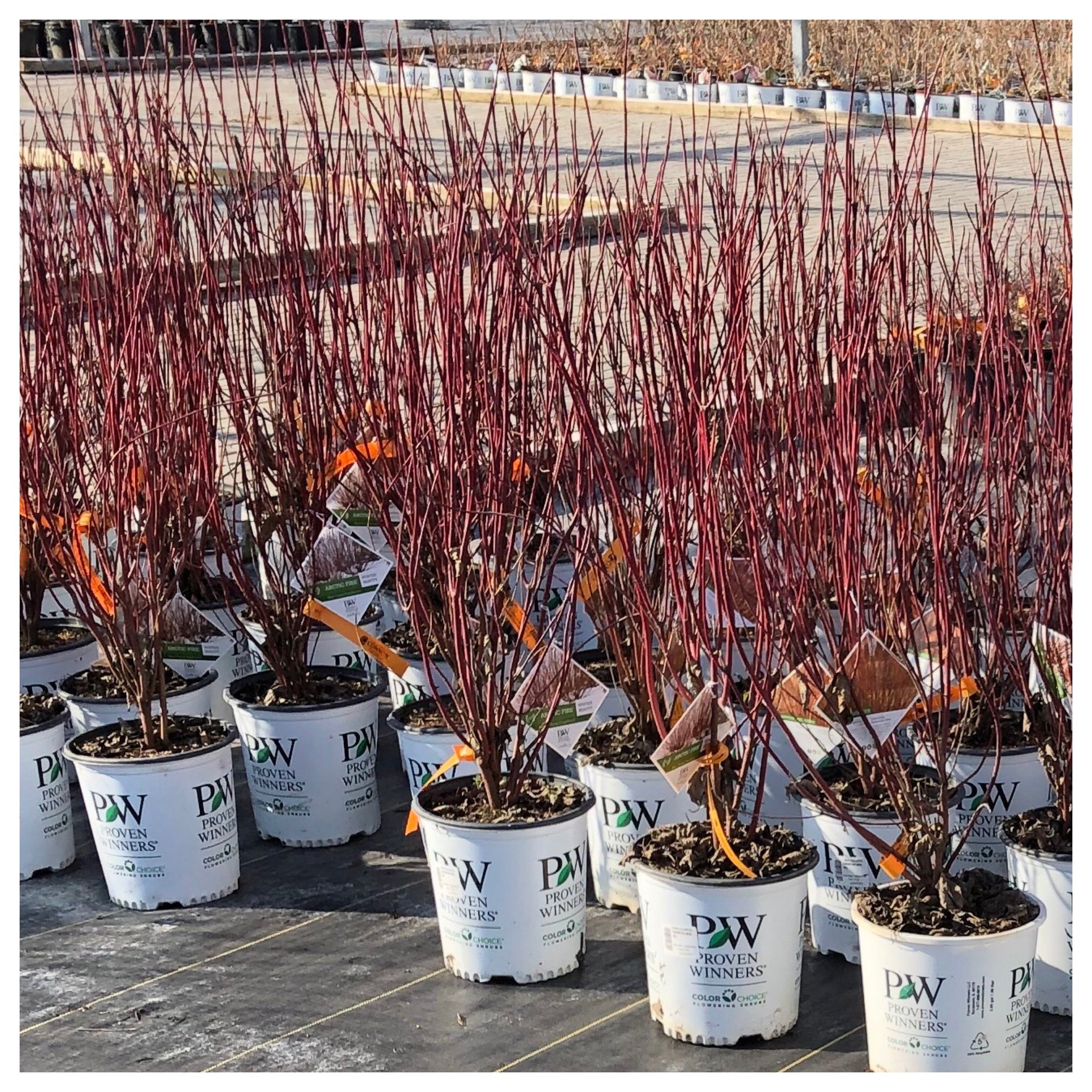 Beautiful in dormancy, Cornusstolonifera ‘Arctic Fire’ awaits relocation to a garden home where they can continue to shine!