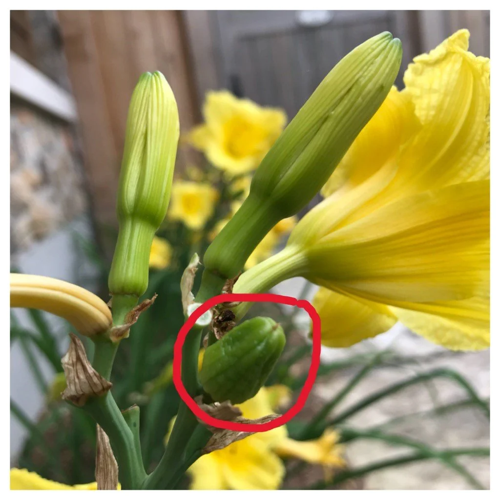 A daylily with lots of flower buds and a seed pod (circled in red).