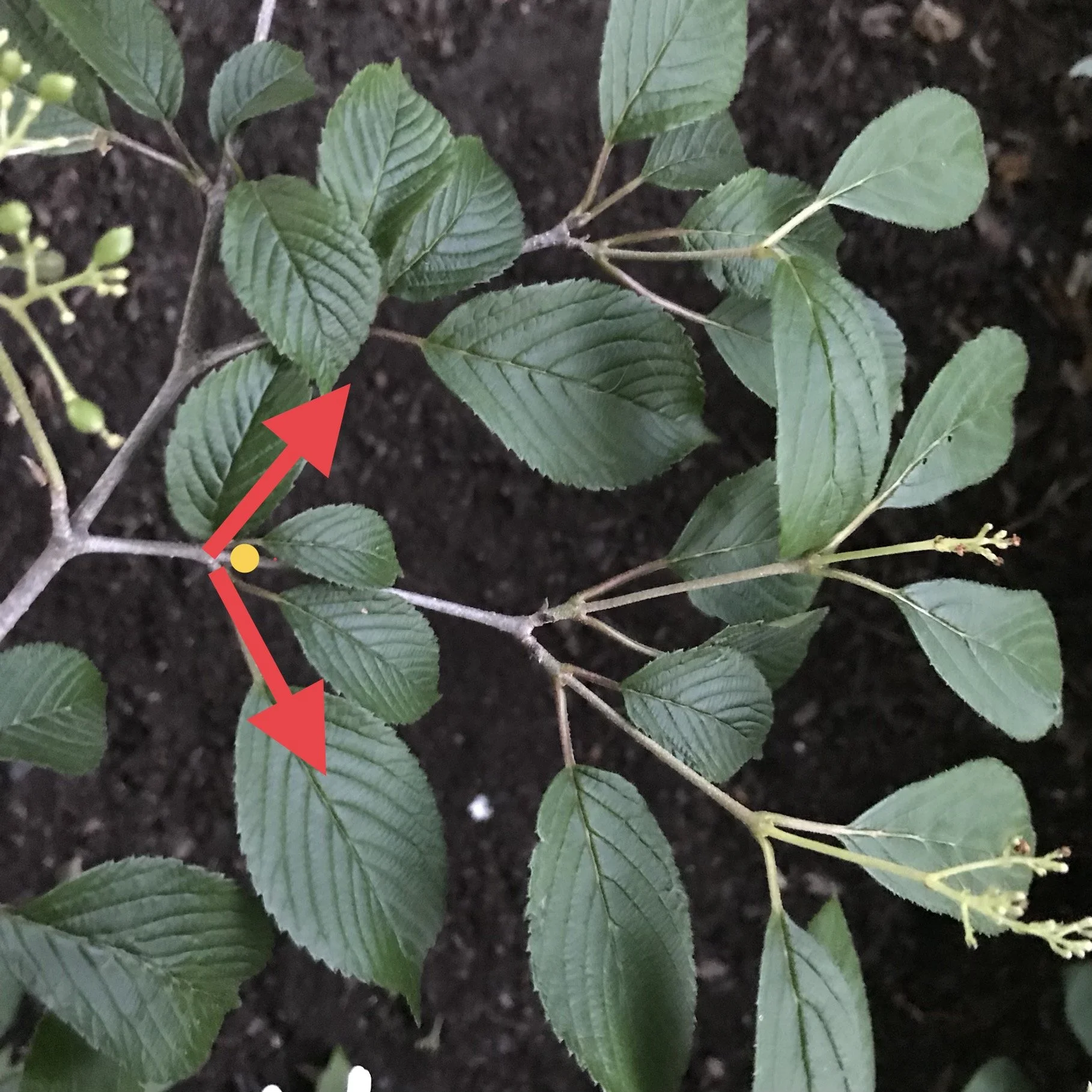 A ‘thinning cut’ back to a lateral branch (indicated by the yellow dot) and the resultant growth directed toward the remaining branch (as indicated by the red arrow).