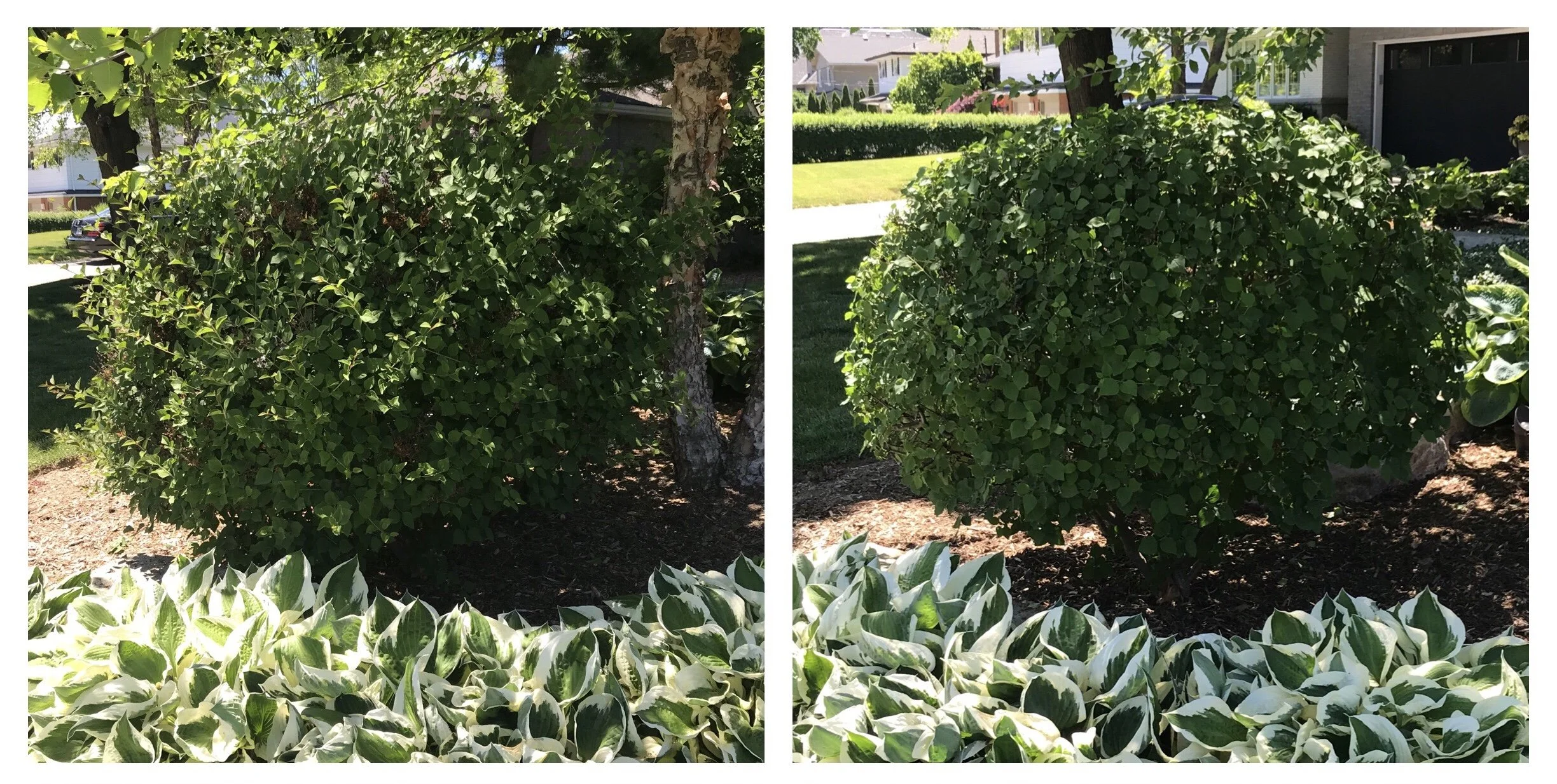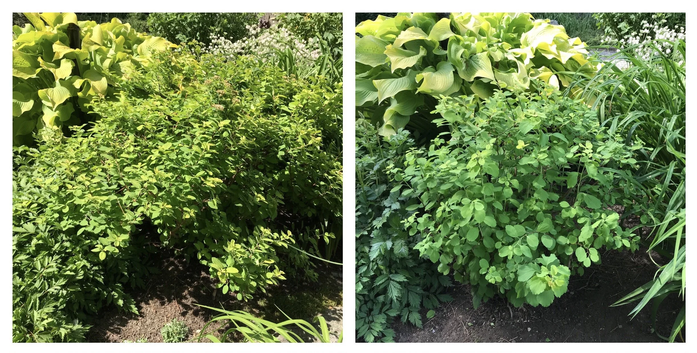A sprawling ‘Glow Girl’ birch leaf spirea (Spirea betulifolia ‘Tor Gold’) immediately after flowering (left) and after a natural prune (right).
