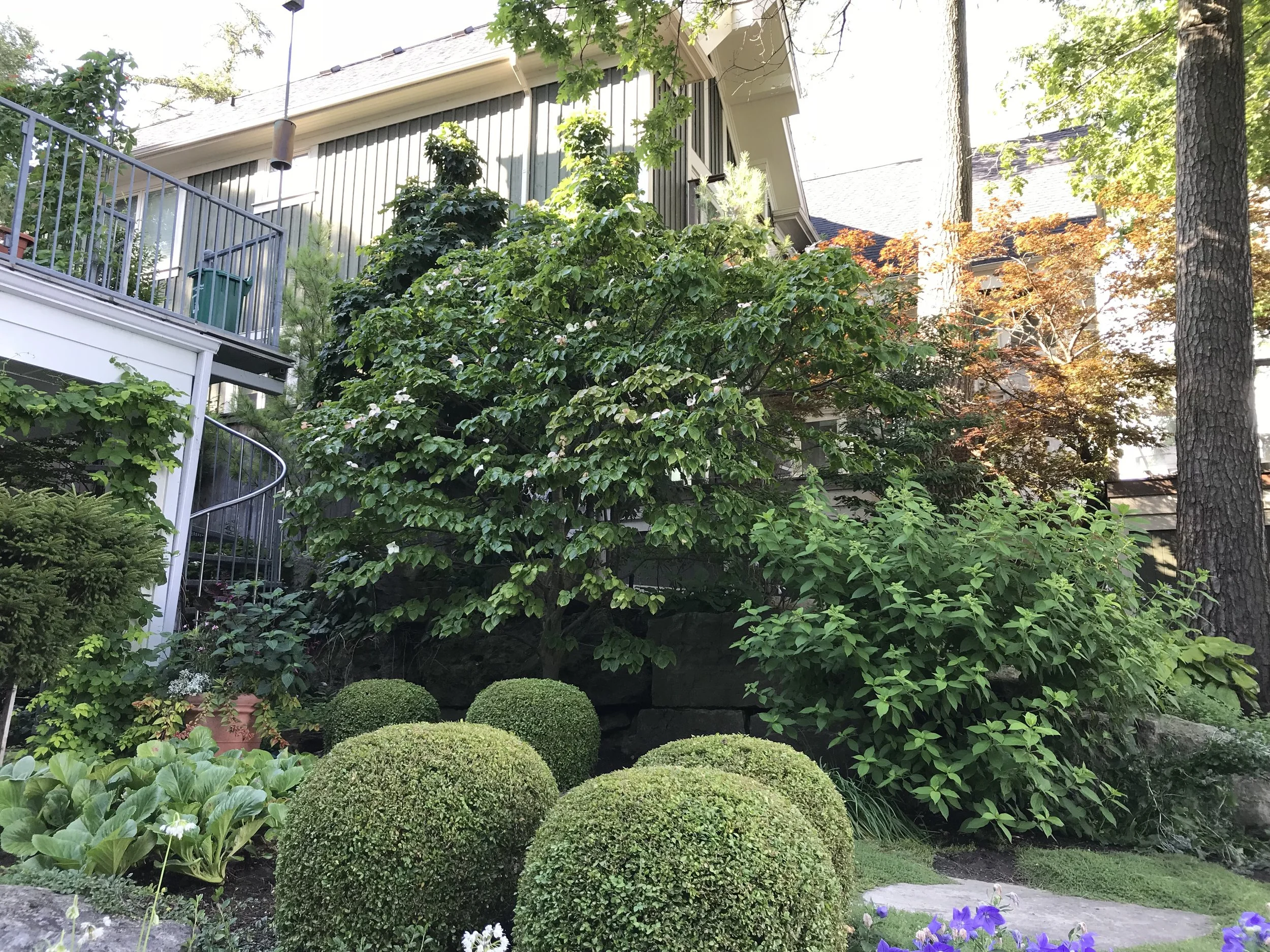 Hedge shears: great for things like boxwood spheres… but not for the other flowering shrubs in the garden (such as the Hydrangea paniculata or Cornus kousa growing in the background).