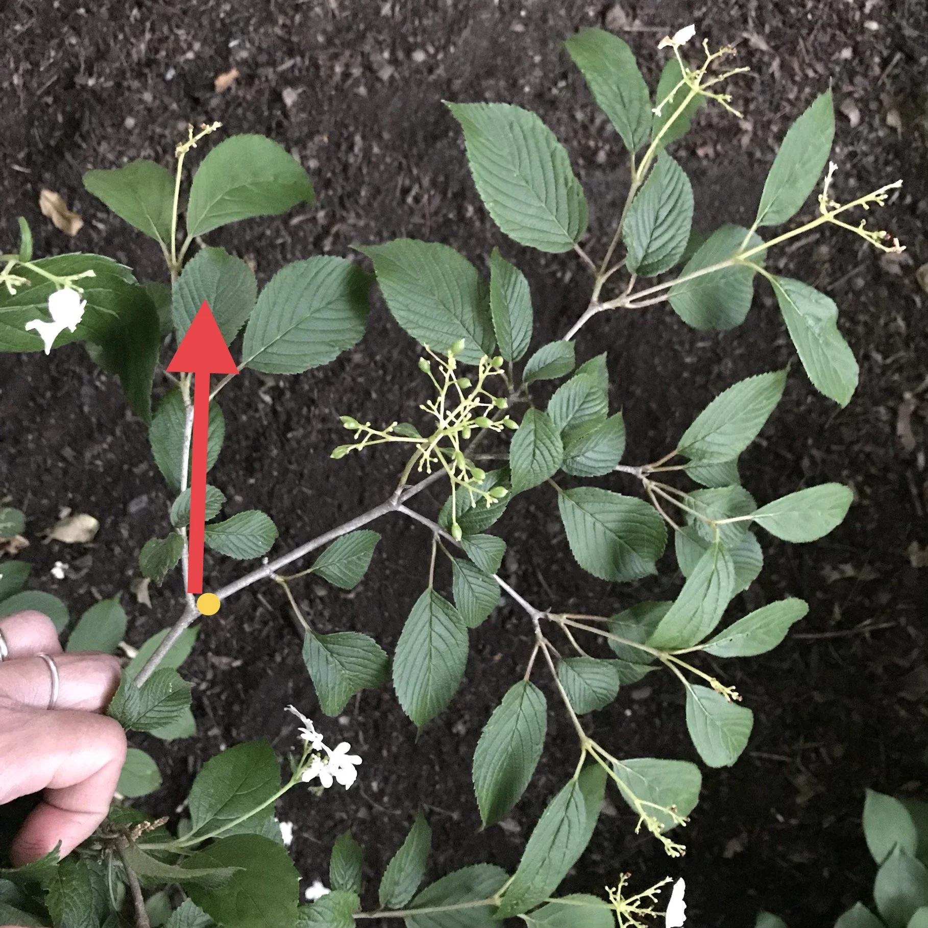 2. Trace this branch back to where it connects with a secondary (lateral) branch somewhere within the shrub