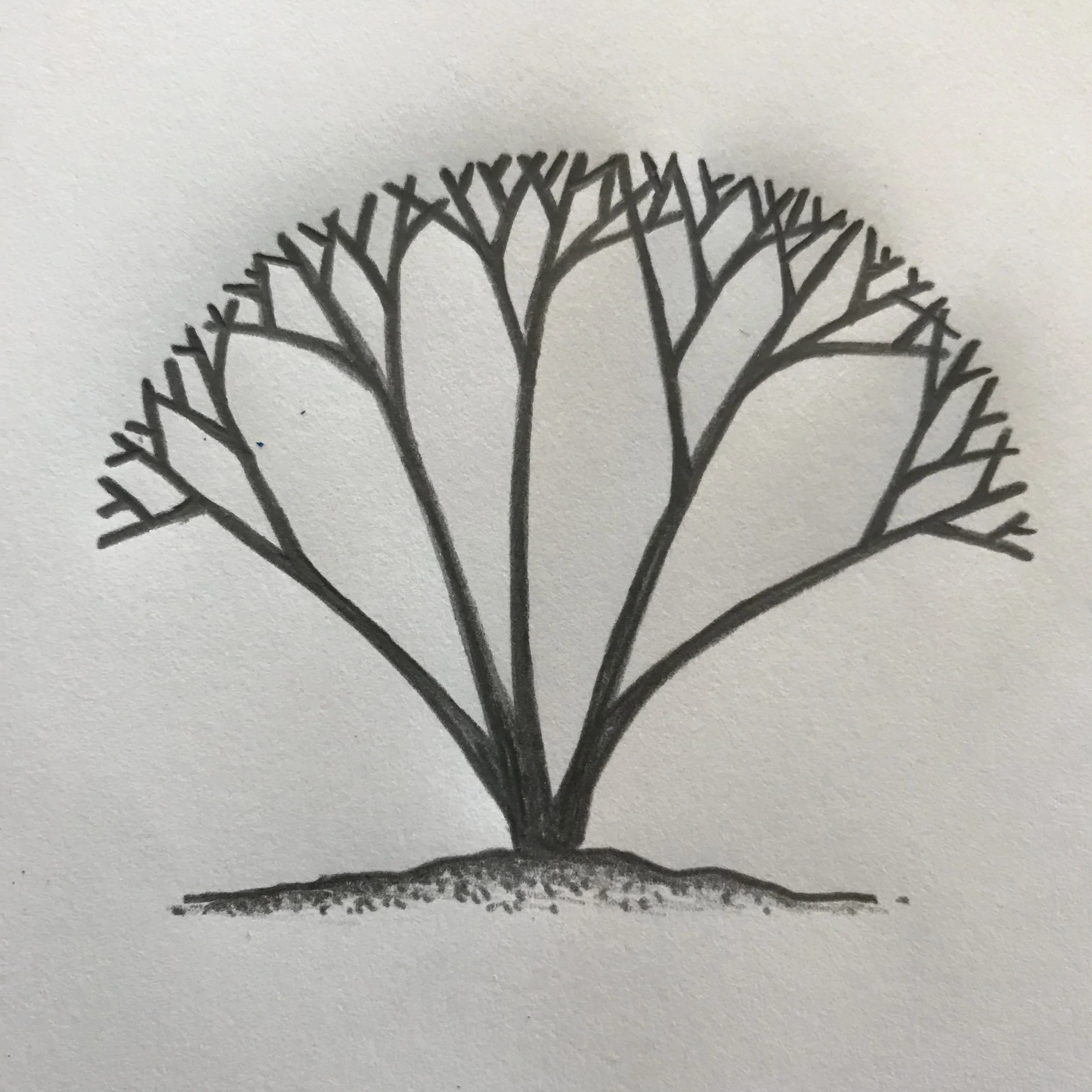 A basic schematic that shows how routine shearing leads to a shrub with very dense branching on the outer edges of the shrub and a sparse interior.