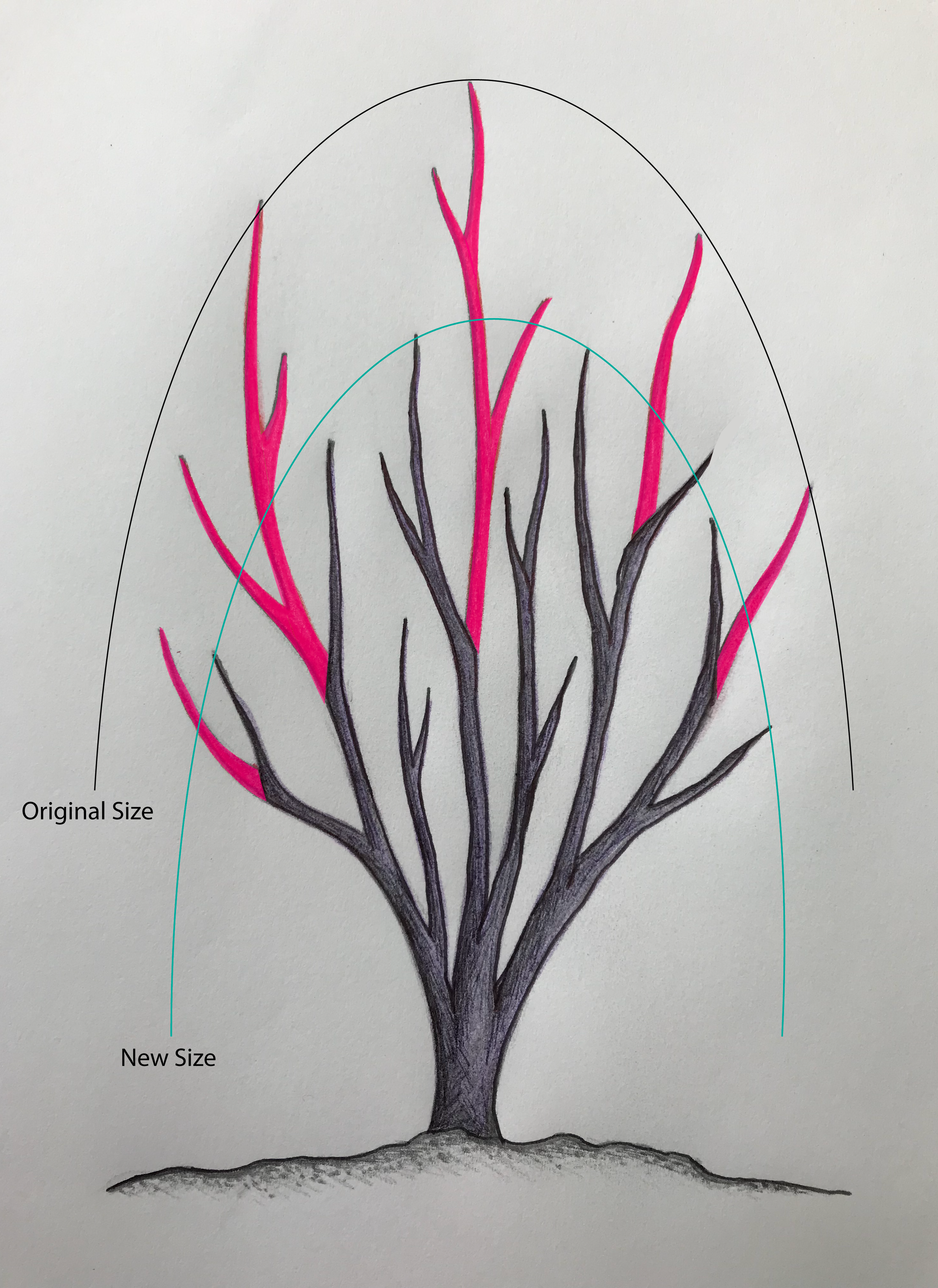 An overly simplified image of a shrub illustrating the use of ‘thinning cuts’ to reduce the overall size. The coral-coloured branches indicate the portions of the shrub to be removed, the rest of the shrub remains. Note that the overall height and size of the shrub has been reduced using this technique.