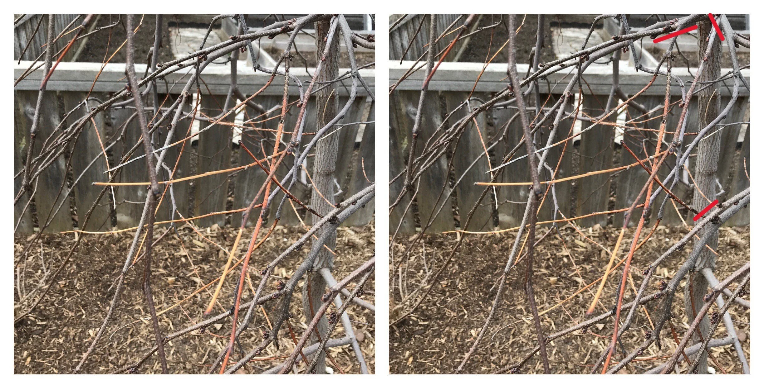 Crossed branches (left) cause damage to the branches through rubbing/abrasion. One of the branches should be removed by cutting it back to a point where it connects to another branch (right); red circle shows the location of the crossed branches.