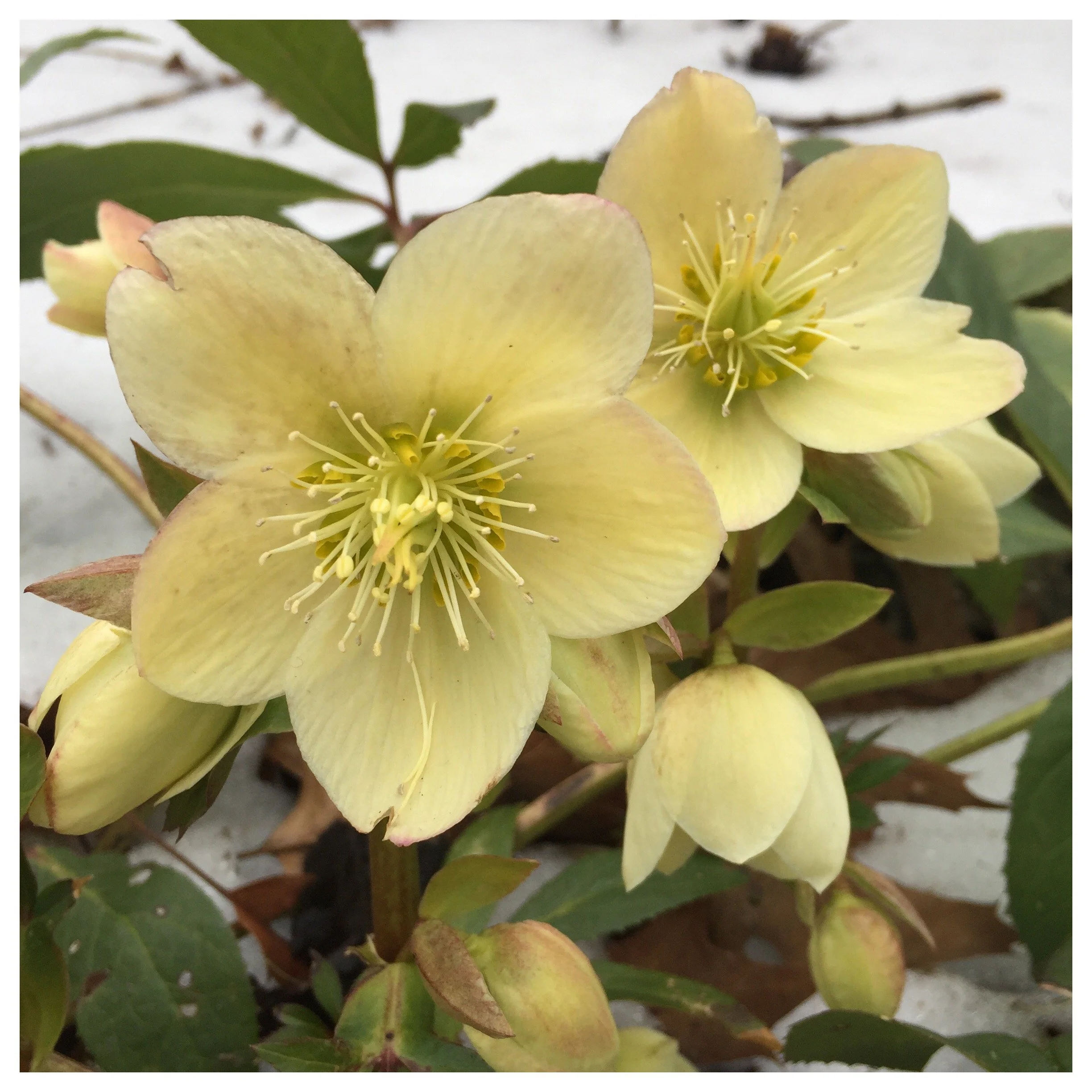 A Helleborus sp. laughing in the face of a late season snowfall.