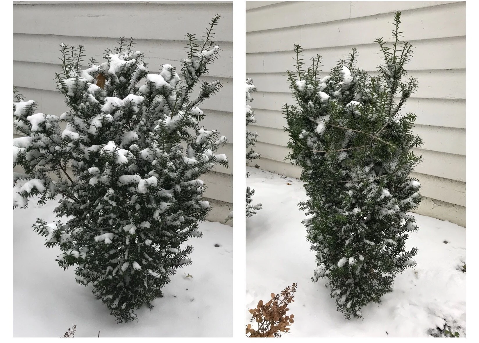 • Upright-growing yews (Taxus spp.) are multi-stemmed (multiple main branches emerging from the base of the plant) and when snow piles up on them the weight can splay the stems in different directions; sometimes the stems bounce back and sometimes they don’t